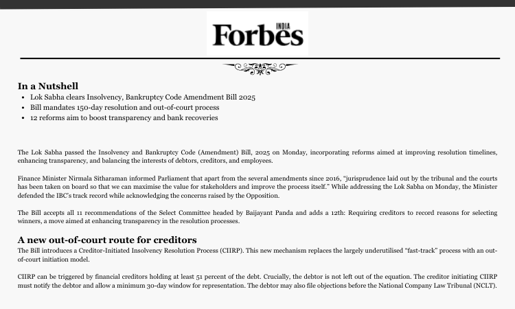 The Lok Sabha passed the Insolvency and Bankruptcy Code (Amendment) Bill, 2025 on Monday, incorporating reforms aimed at improving resolution timelines, enhancing transparency, and balancing the interests of debtors, creditors, and employees.