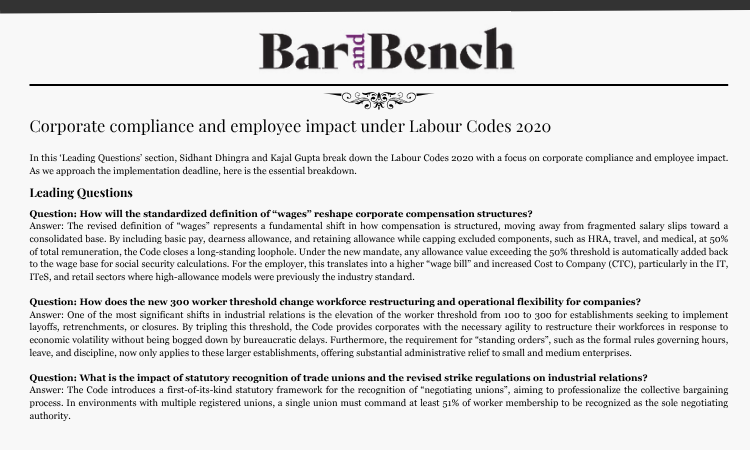 In this ‘Leading Questions’ section, Sidhant Dhingra and Kajal Gupta break down the Labour Codes 2020 with a focus on corporate compliance and employee impact. As we approach the implementation deadline, here is the essential breakdown.