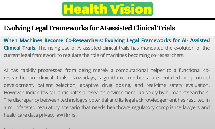 Adv. Varun Singh examines how evolving legal and regulatory frameworks must adapt to govern AI-assisted clinical trials while safeguarding patient rights, data privacy, and ethical compliance.