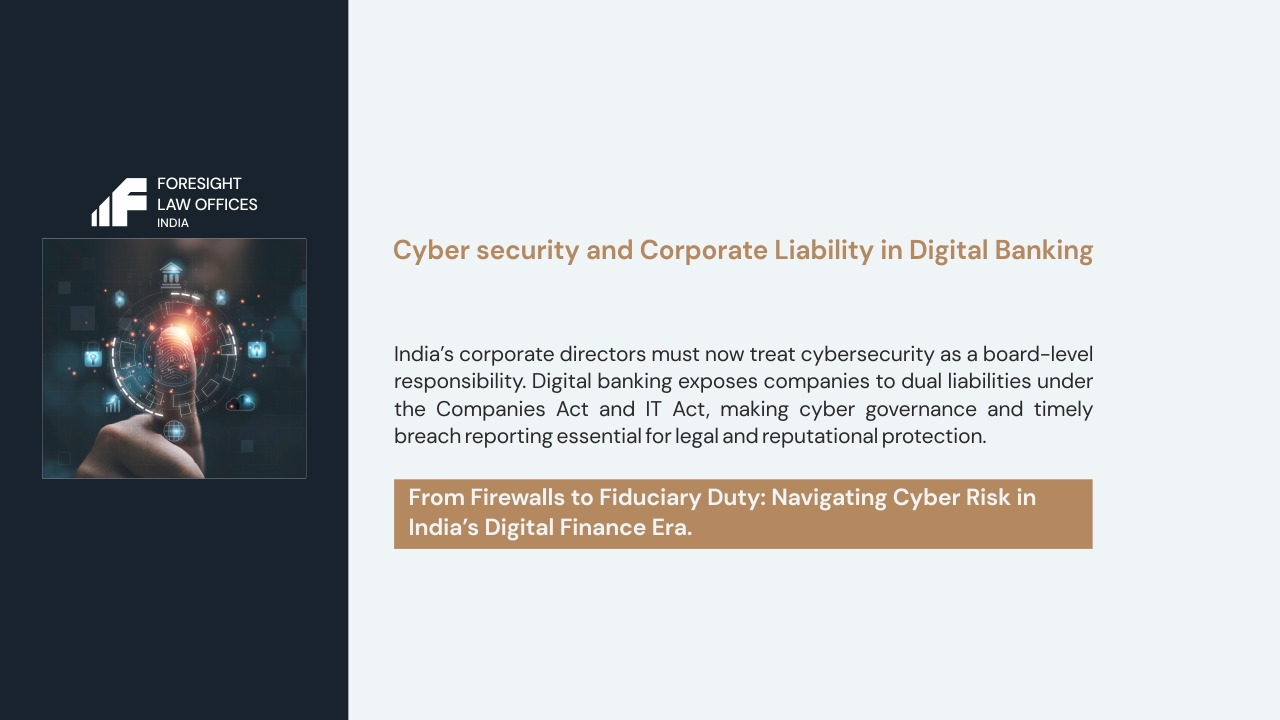 With the recent Digital Personal Data Protection Act (DPDP Act, 2023) adding another regulatory layer, financial firms must treat cybersecurity governance as a board-level priority. Whether operating a payment gateway, offering digital lending, or managing corporate accounts, financial service providers must embed legal compliance into their tech stack. This page outlines the intersection of finance, cybersecurity, and corporate liability in the evolving Indian regulatory landscape.
